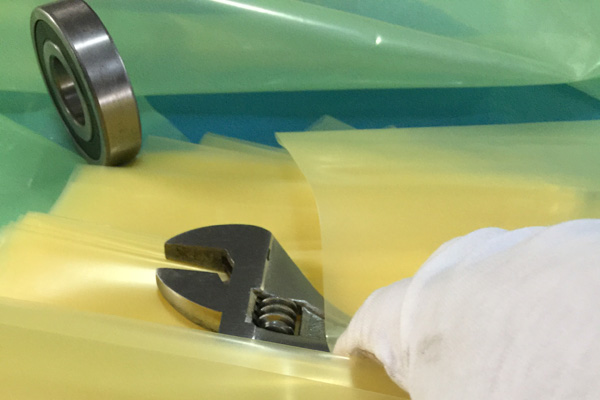 VCI氣相防銹膜(防銹袋)是將高分子聚乙烯樹(shù)脂(LDPE)與功能VCI樹(shù)脂配比混合,采用現(xiàn)代薄膜共擠技術(shù)生產(chǎn)的新一代復(fù)合防銹薄膜。具有良好的氣化防銹性能、阻隔防潮、使用方便、透明直觀等特點(diǎn);當(dāng)用塑料袋包裹金屬產(chǎn)品時(shí),氣相緩蝕劑在封閉空間內(nèi)氣化并凝聚在所有金屬表面上形成氣相保護(hù)層,從而防止金屬產(chǎn)品銹蝕。符合GB-T19532-2004防銹性能要求。